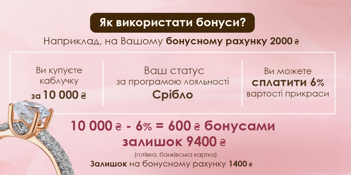 Получайте преимущество за каждое ваше действие. Например, покупайте украшения в магазине, на сайте или в приложении и получайте бонусные гривны на следующие покупки в размере процента от суммы чека.