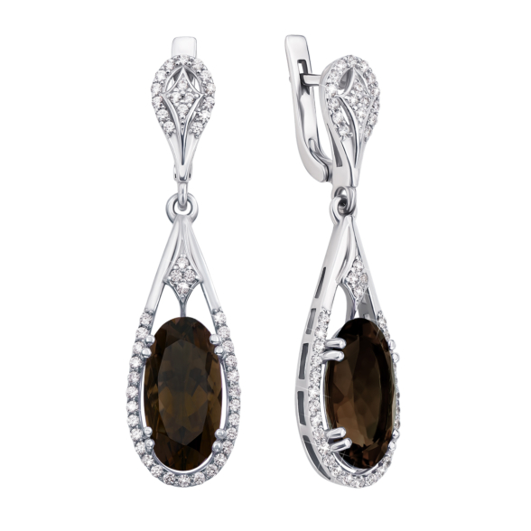 Серьги-подвески из серебра 925 пробы с дымчатым кварцем и фианитами