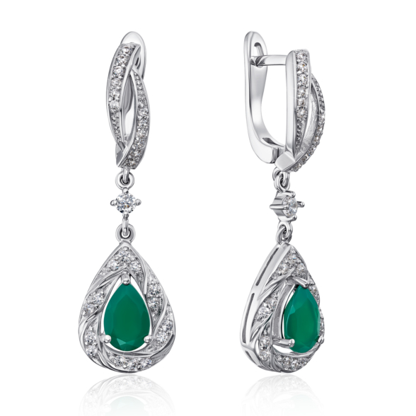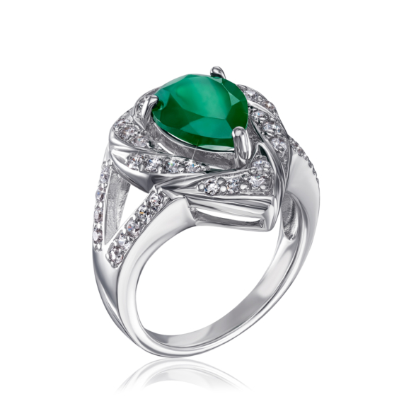 Кольцо из серебра 925 пробы с зеленым агатом и фианитами.
