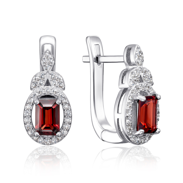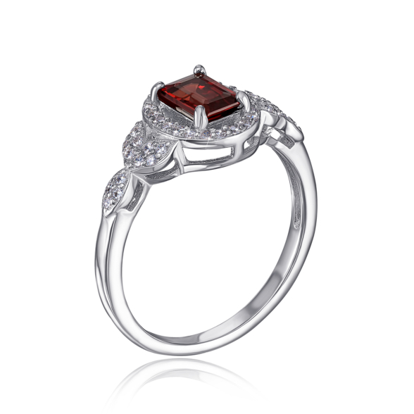 Кольцо из серебра 925 пробы с красным гранатом (пироп) в форме октагон и фианитами.