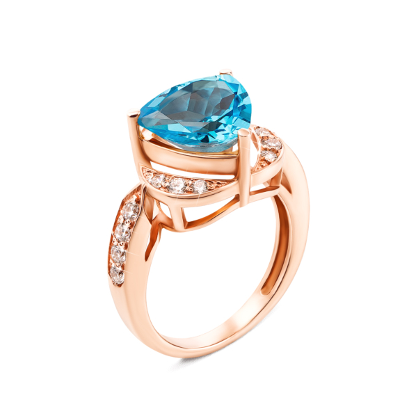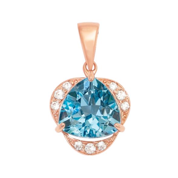 Золотая подвеска с топазом небесно-голубого цвета выполнена в форме небольшого цветка с тремя лепестками, украшенными россыпью кубического циркония (фианитами). Полудрагоценный камень треугольной огранки, расположенный в центре изделия, станет ярким акцентом в любом образе.