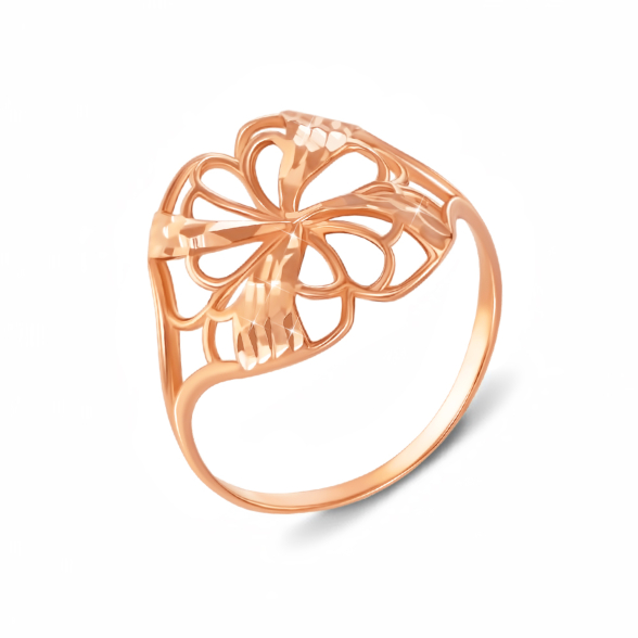 Кольцо из красного золота 585 пробы с алмазной гранью – это практически невесомое утонченное украшение. Ажурный цветок, сплетённый из тончайших золотых линий, станет оригинальным акцентом в каждом образе и обязательно привлечет внимание окружающих.