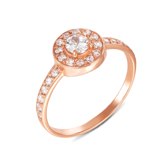 Кольцо из красного золота 585 пробы с фианитами выполнено в традиционном классическом дизайне. В центре изделия расположен более крупный фианит, который окружает россыпь фианитов небольших размеров. Круглая форма центральной части ювелирного изделия и лаконичность выполнения украшения делают кольцо очень стильным и элегантным.