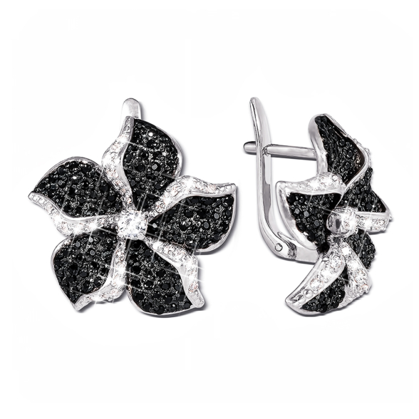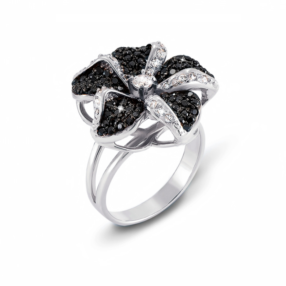 Кольцо из белого золота 585 пробы гармонично дополнит образ девушки, которая любит роскошные и стильные украшения. Ювелирное изделие, выполненное в форме цветка, нежные лепестки которого усыпаны прозрачными и чёрными фианитами, будет эффектно выглядеть и подчеркнет замечательный вкус своей обладательницы.