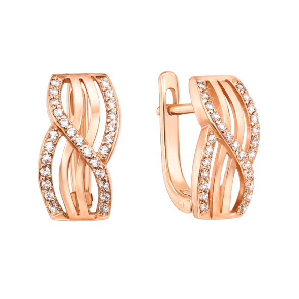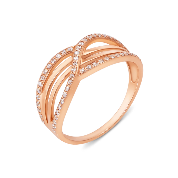 Кольцо из красного золота 585 пробы с фианитами – это ювелирное изделие, в дизайне которого умело соединены блеск драгоценного металла и сияние россыпи фианитов, которые расположены на золотых линиях, переплетающихся с гладкими полированными золотом.