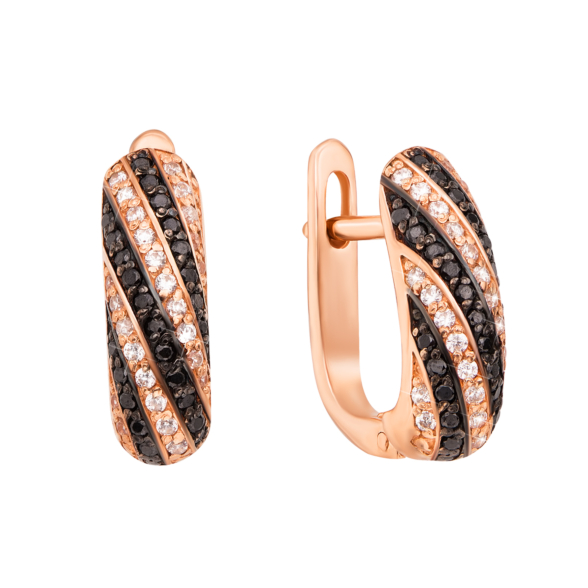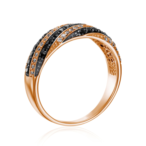 Золотое кольцо, усыпанное фианитами черного и белого цвета – заметное украшение, притягивающее взгляды. Массивное широкое кольцо из красного золота 585 пробы в верхней части украшено линиями белых и черных камней. Такая комбинация делает украшение невероятно привлекательным и изысканным.