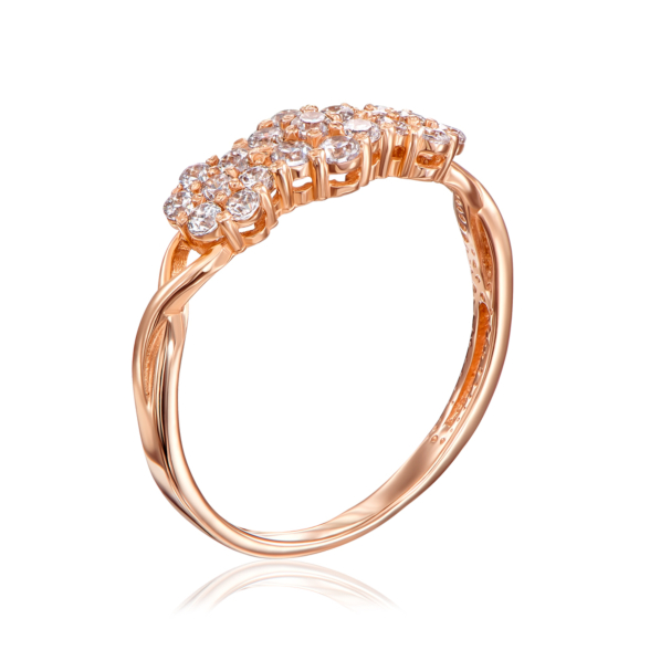 Кольцо из красного золота с фианитами подчеркнет изысканный стиль своей обладательницы. Мягкий блеск драгоценного металла в сочетании с ярким сиянием кубического циркония (фианитов) создают гармоничную композицию в виде трех цветков, которые станут основным акцентом в повседневном образе.