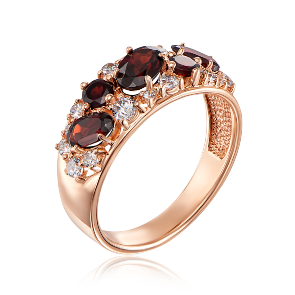 Кольцо из красного золота 585 пробы с гранатом (пироп) круглой и овальной огранки и фианитами.