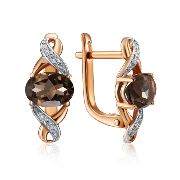 Кольцо из красного золота с раухтопазом в комплекте с серьгами станет главным акцентом в нежном вечернем образе.