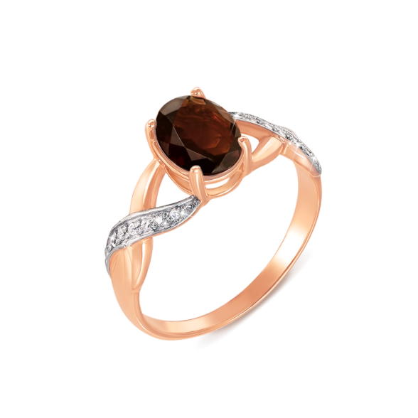 Золотое кольцо с раухтопазом и фианитами станет воплощением изысканности, грациозности и утонченности. Красоту полудрагоценного камня насыщенного чайного цвета, расположенного в центральной части украшения, подчеркивают ленты из золота красного и белого цвета, которые переплетаются, создавая гармоничную композицию сияния и тепла. Россыпь фианитов на белом фоне придает дизайну особые, эксклюзивные нотки.
