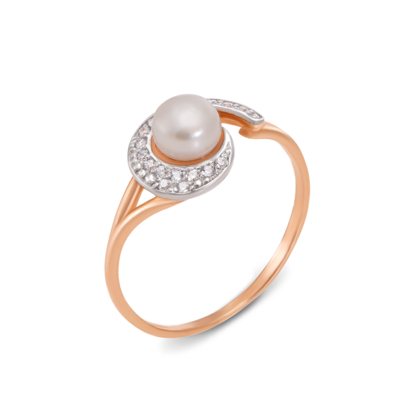 Золотое кольцо с жемчугом и фианитами. Артикул 12271 с