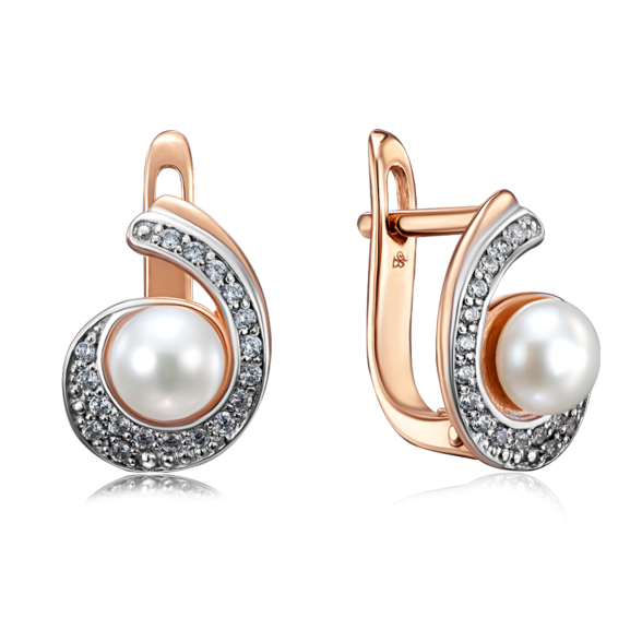 В золотом кольце, украшенном жемчугом и россыпью фианитов, сочетается неповторимый шарм и легкость, которая так нравится всем женщинам. Линия гладкого кольца из красного золота 585 пробы переплетается с завитком металла белого , усыпанного небольшими камешками, а венчает композицию крупная жемчужина.