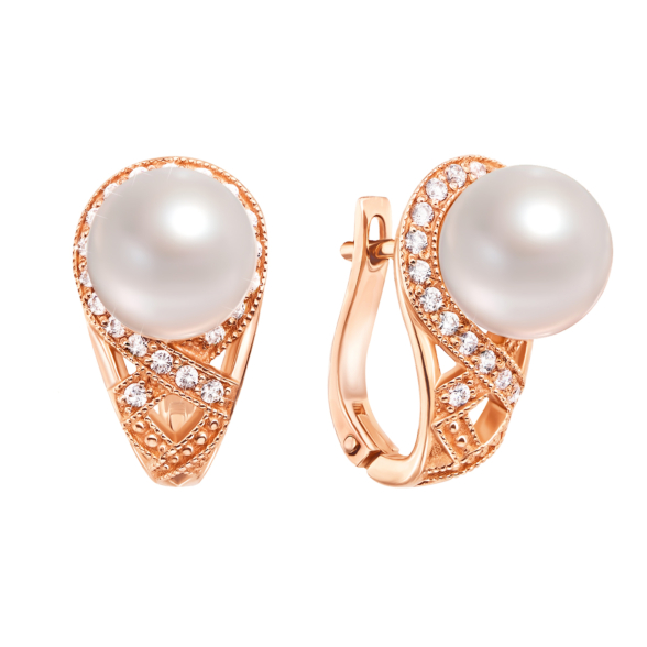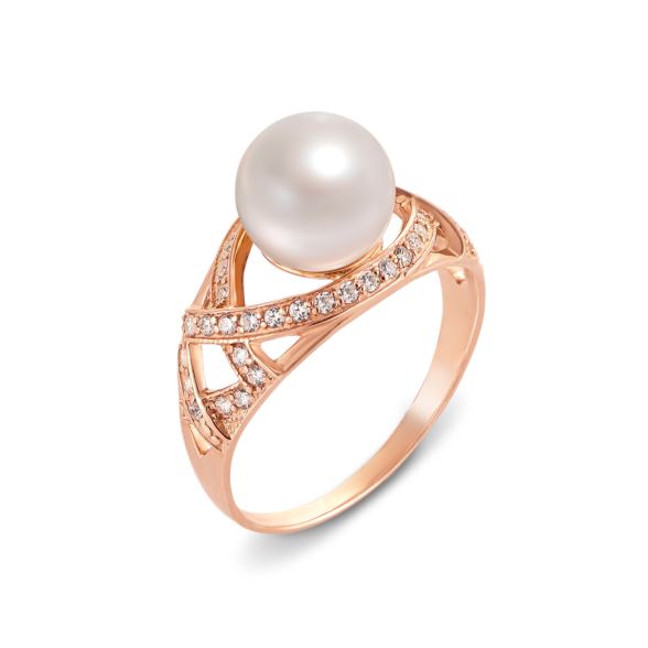 Роскошное кольцо из красного золота с жемчугом и вставками кубического циркония (фианитами) добавит в ваш образ нотки элегантности и аристократичности. Дизайн кольца очаровывает изысканностью контуров и мерцанием камней. Перламутровое сияние жемчужины, расположенной на куполе из пересекающихся линий, гармонично дополняет мерцание белых фианитов.