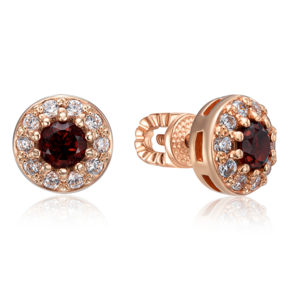Пуссеты из красного золота 585 пробы с гранатом и фианитами