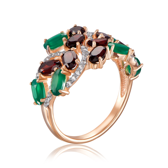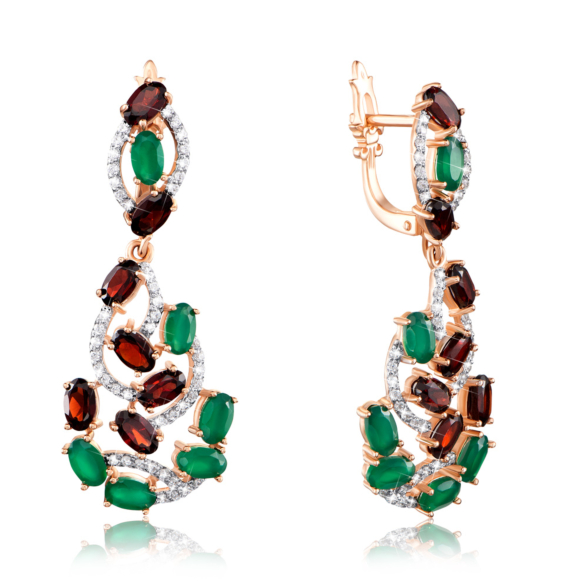 Серьги-подвески из красного золота 585 пробы с агатом, гранатом и фианитами.