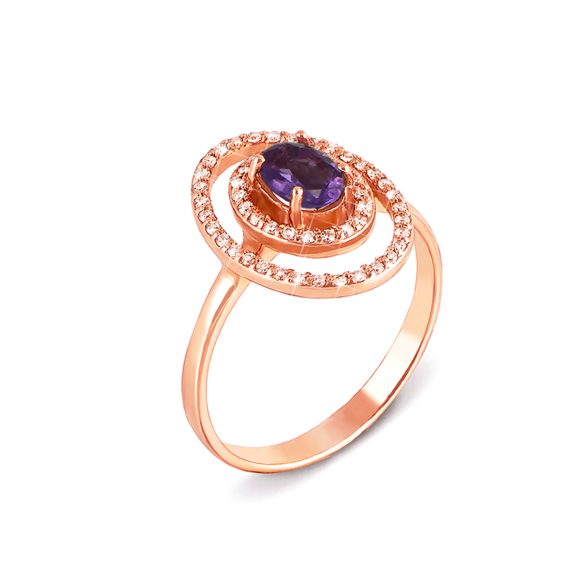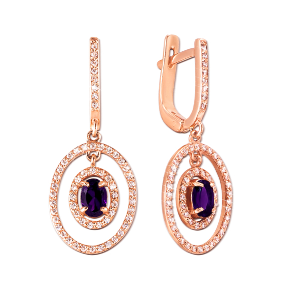 Серьги-подвески из красного золота 585 пробы украшены аметистом и фианитами, обрамляющими полудрагоценный камень насыщенного лилового цвета в центре композиции. Овальная огранка аметиста гармонирует с плавными линиями и округлыми формами сережек.