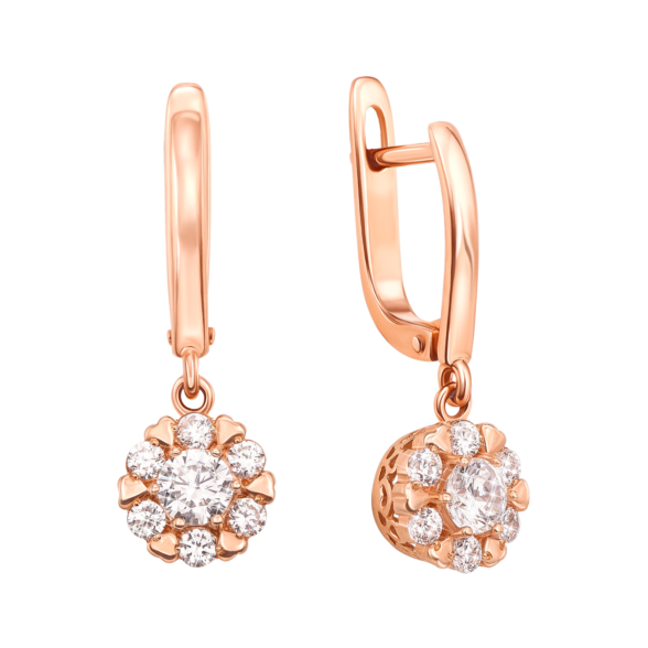 Нежные золотые серьги-подвески со вставками кубического циркония (фианитами) станут отличным дополнением к вашему образу. Сияние красного золота дополнено мерцанием прозрачных фианитов, а крапановое крепление прекрасно подчеркивает красоту и чистоту более крупного камня. Все элементы украшения объединены в гармоничную и романтичную композицию.