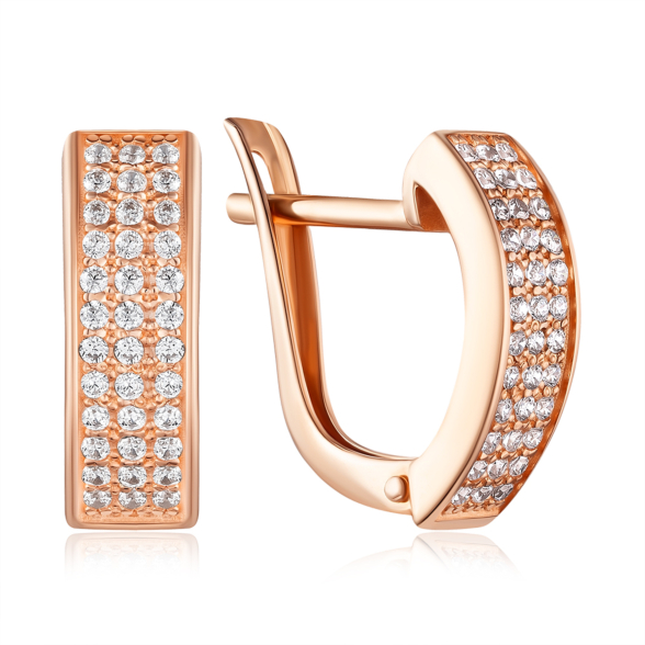 Серьги из красного золота 585 пробы выполнены в классическом лаконичном дизайне. Украшения прямоугольной формы имеют округлые формы, поэтому смотрятся очень аккуратно и утонченно. На поверхности серёжек расположены три фианитовые дорожки, которые мерцают в лучах солнечного света, делая акцент на нежности и элегантности своей обладательницы.