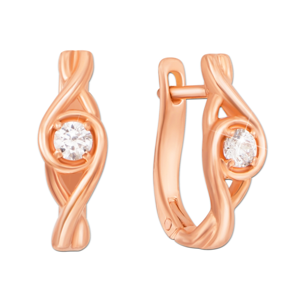 Нежные серьги из красного золота 595 пробы с небольшими мерцающими фианитами гармонично дополнят образ современной и стильной женщины. Переплетение золотых линий удачно подчеркивает красоту камней, расположенных в центральной части ювелирного изделия. Ваш повседневный образ всегда будет женственным, если его дополнить золотыми серьгами.