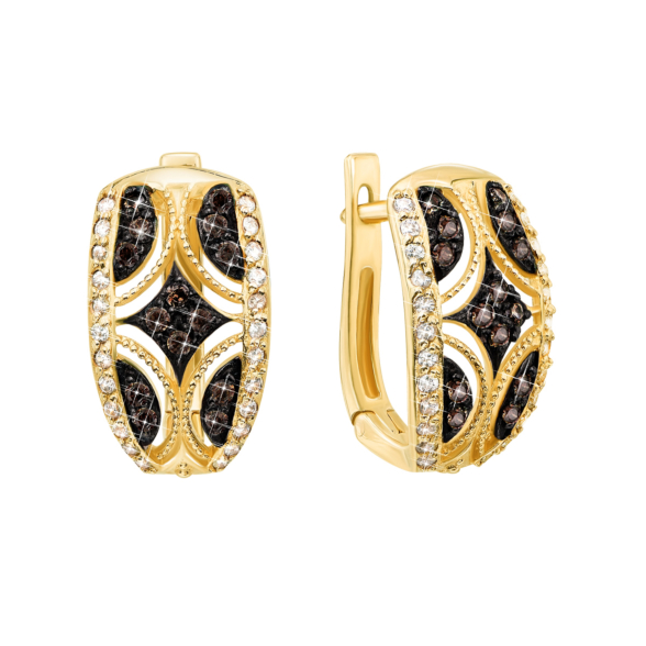 Роскошные золотые серьги с коньячными и белыми фианитами – это эксклюзивное украшение, выполненное в лучших традициях ювелирного искусства. Классический дизайн в сочетании с оригинальными формами и сиянием разноцветных камней подчеркнет превосходный вкус своей обладательницы и привнесет в ее образ роскошь и шик. Стильные золотые серьги с фианитами подчеркнут вашу индивидуальность и утонченный вкус.