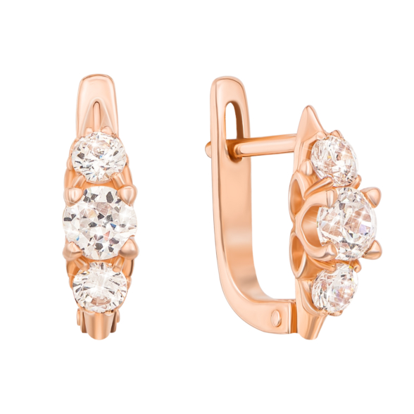 Золотые серьги очаровывают своим элегантным видом и блеском фианитов. Серьги в классическом исполнении из красного золота со вставками крупных камней смотрятся утонченно и богато. Изысканный дизайн с плавными, пересекающимися линиями прекрасно подойдет к образу стильной леди.