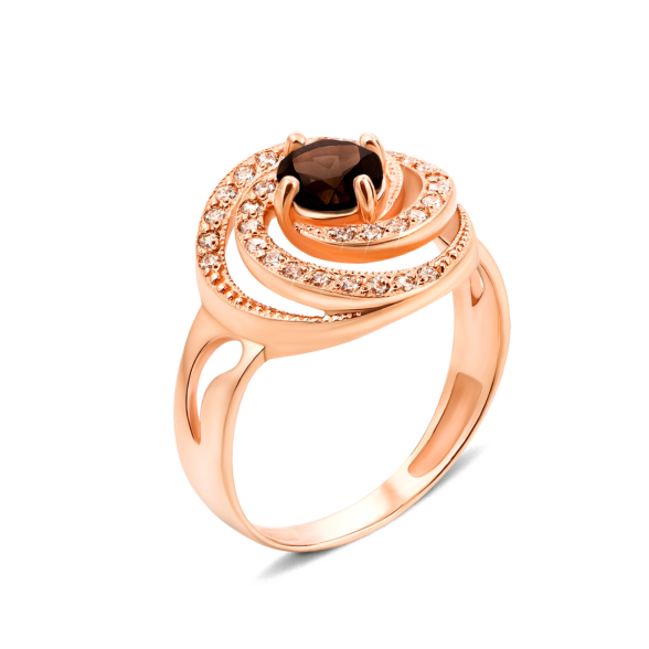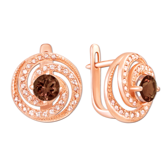 Серьги из красного золота 585 пробы украшены россыпью искрящихся фианитов, а линии, закрученные спиралью, словно устремлены к раухтопазу круглой огранки. Серьги с раухтопазом оснащены качественным английским замком, а сияние золота подчёркивает красоту каждой грани полудрагоценного камня. В комплекте с кольцом и подвеской они создают нежный, летний образ.