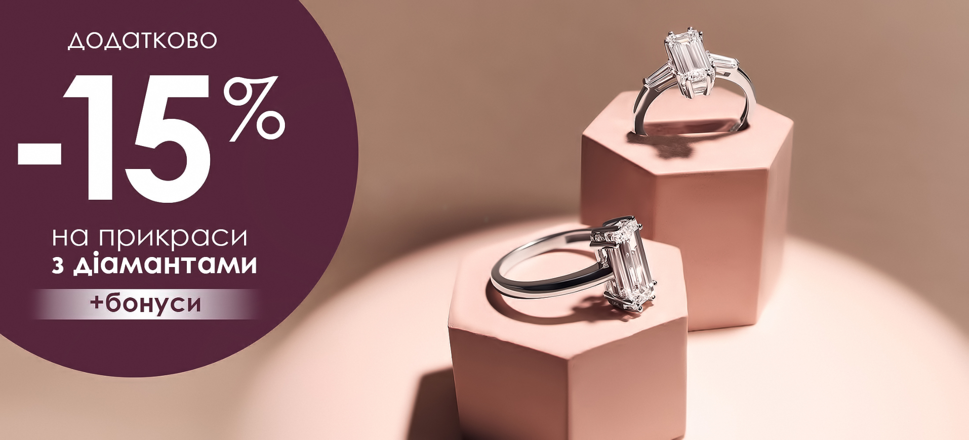 - Прикраси з діамантами. В цьому розділі представлені прикраси з інкрустацією діамантів. В основному це каблучки, однак можна знайти також і кольє, сережки, брошки, хрестики і підвіски. Діаманти - вкрай рідкісний і складний в плані обробки мінерал, звідси і більш висока ціна ювелірних виробів. Однак краса таких прикрас виправдовує все, і якщо ви по-справжньому любите свою другу половинку, то прикраси з цієї категорії точно для вас.