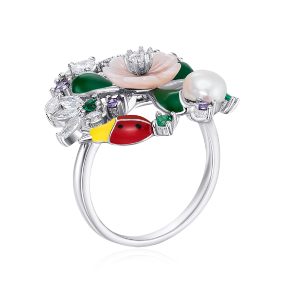 Срібна каблучка «Квіти» з фіанітами та емаллю. Артикул SR30614-BW-R/12/2282