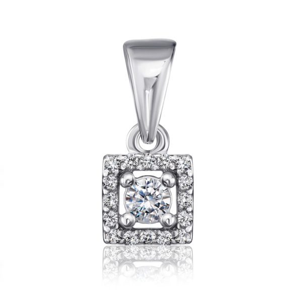 Підвіска зі срібла з фіанітами, виконана в квадратній формі, стане кращим доповненням до яскравого і стильнго образу. Срібна підвіска з фіанітами стане яскравим акцентом завдяки незвичайній формі і мерехтіння каменів.