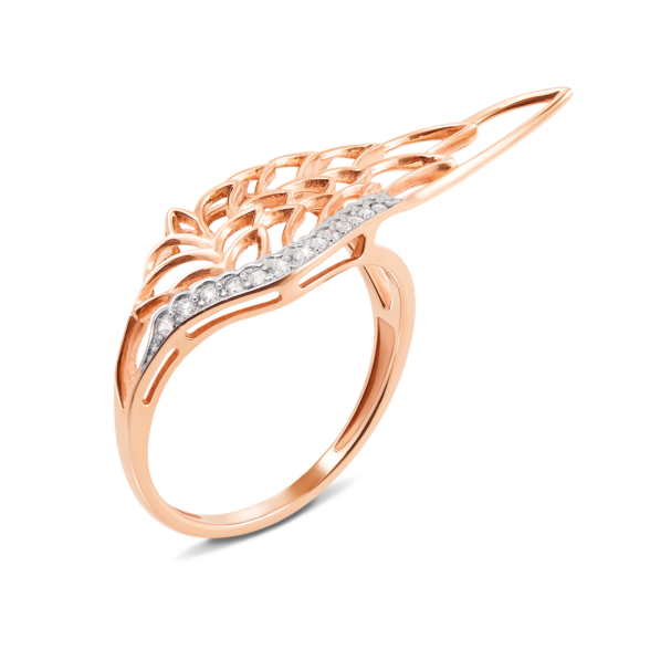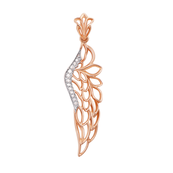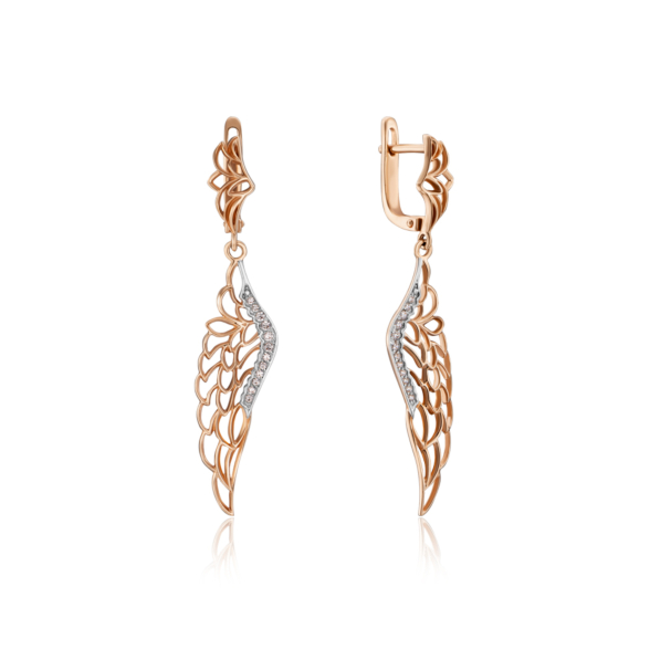 Сережки-підвіски з червоного золота 585 проби з фіанітами, виконані у формі крил, стануть оригінальним доповненням до вашого образу. Золоті крила, сяючі в променях софітів розсипом фіанітів, перетворять свою володарку в стильну леді.