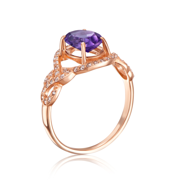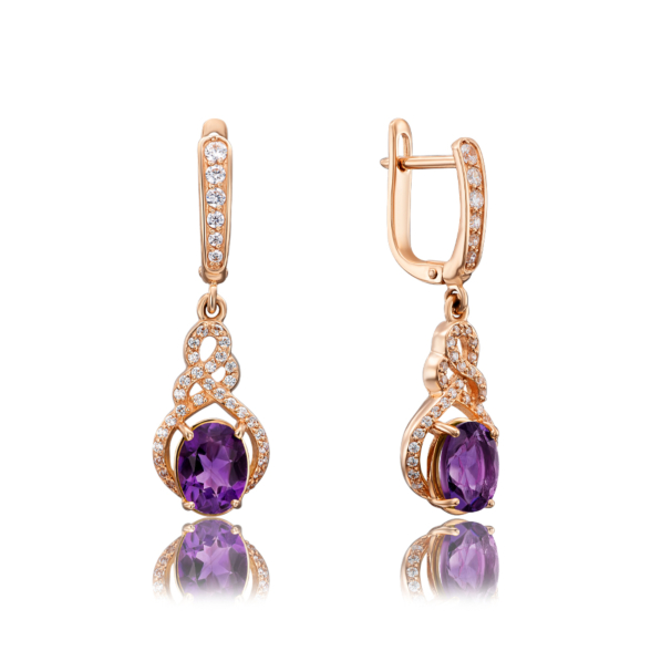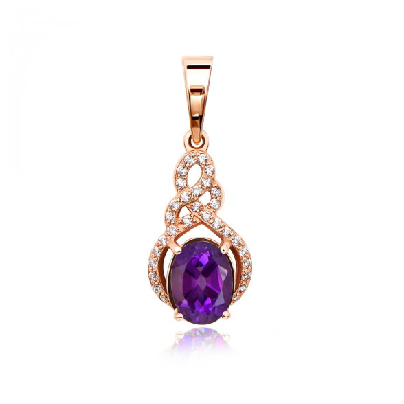 Підвіска з червоного золота 585 проби з аметистом та фіанітами в поєднанні з каблучкою і сережками стане чудовим доповненням до вечірнього або коктейльного образу.