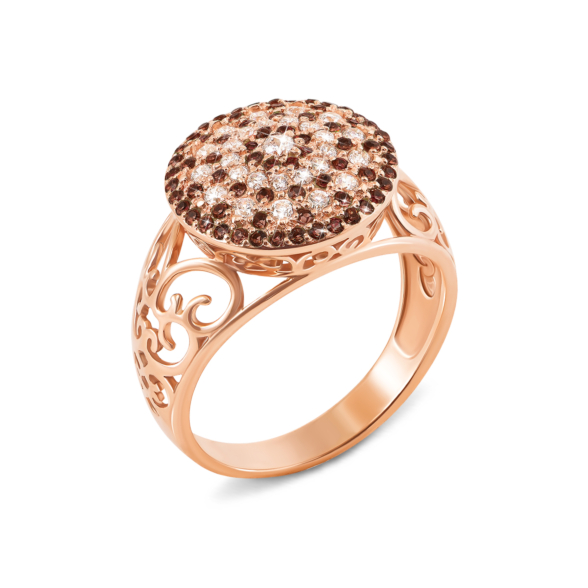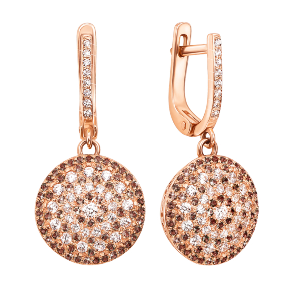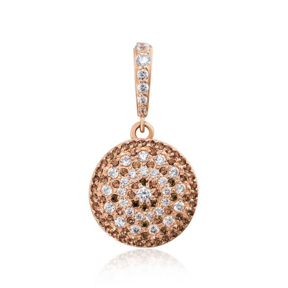 Розкішна підвіска з червоного золота 585 проби обов'язково приверне увагу оточуючих завдяки розсипу прозорих і коньячних фіанітів, які покривають всю поверхню прикраси, чергуючись між собою. Така гармонійна композиція ідеально підкреслить красу вечірнього образу кожної жінки. Золота підвіска з різнокольоровими фіанітами стане шикарним акцентом, а в комплекті з сережками і каблучкою буде виглядати бездоганно.