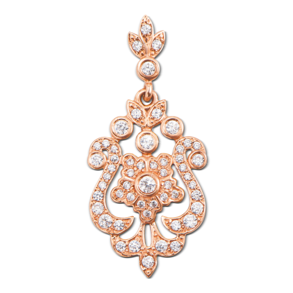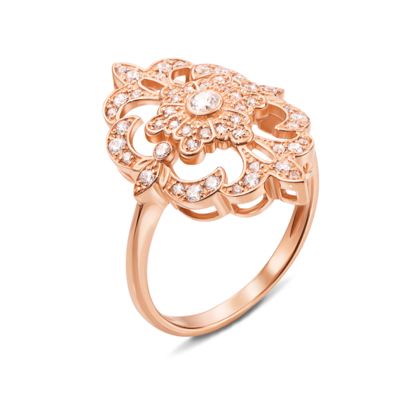 Розкішна підвіска з червоного золота 585 проби з прозорими фіанітами - це легка і повітряна прикраса, яка підкреслить ніжність і граціозність своєї власниці. Кожна золота лінія, декорована фіанітами, з'єднується в прекрасній і гармонійної композиції.