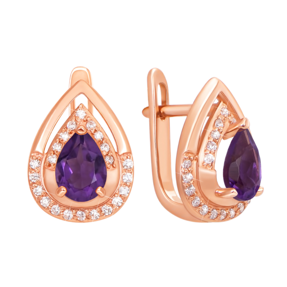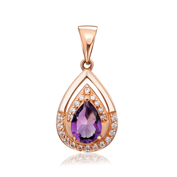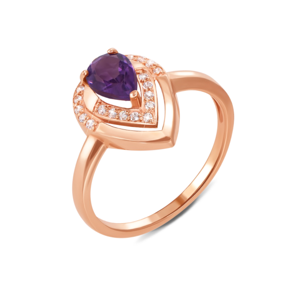 Каблучка з червоного золота з аметистом і фіанітами зробить образ своєї власниці яскравим і незабутнім. М'який блиск червоного дорогоцінного металу вдало відтіняє сяйво напівдорогоцінного каміння, а прозорий блиск фіанитів підкреслює глибину і насиченість лілового кольору аметисту.