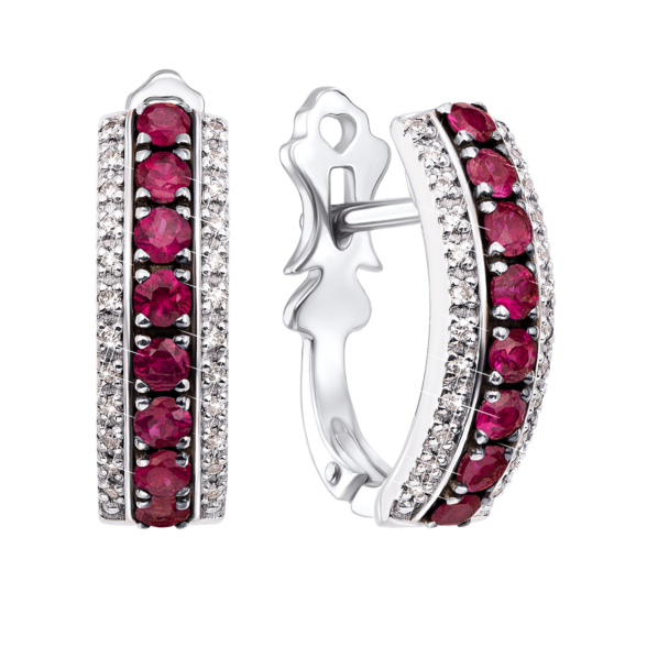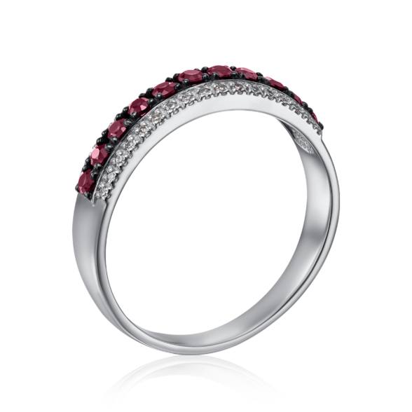 Каблучка з білого золота 585 проби з діамантами і рубінами - витончена і оригінальна прикраса. Холодний блиск прозорих діамантів в поєднанні з благородним кольором білого золота ідеально поєднується з насиченим сяйвом рубінів, розташованих у вигляді доріжки по верхній частині прикраси. Проста і елегантна форма виробу приверне до себе захоплені погляди оточуючих.