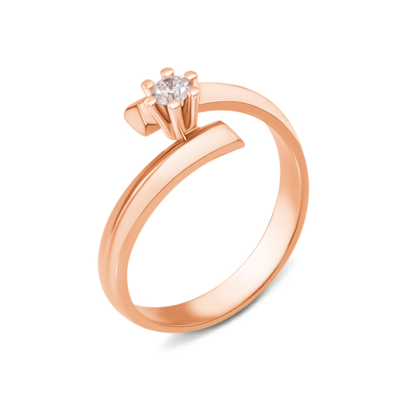 Каблучка з червоного золота 585 проби з діамантом виконана в кращих традиціях ювелірного дизайну. У композиції цієї прикраси з'єднані сдержанная лаконічність і граціозна витонченість. Дві золоті стрічки, скріплені в центральній частині мініатюрним бутоном з серединкою-діамантом, стануть символом ніжності і вишуканості своєї власниці.
