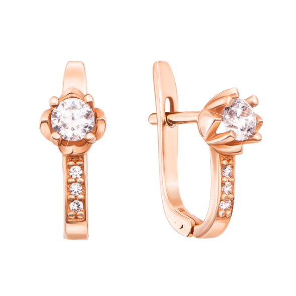 Каблучка з червоного золота 585 проби з фіанітами виконана у кращих традиціях ювелірного мистецтва. У центрі прикраси розташований фіаніт у крапановой закріпці, до якого спрямовуються дві золоті стрічки, декоровані вставками кубічного цирконію (фіанітами). У дизайні цього ювелірного виробу поєднується простота і вишуканість.