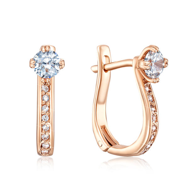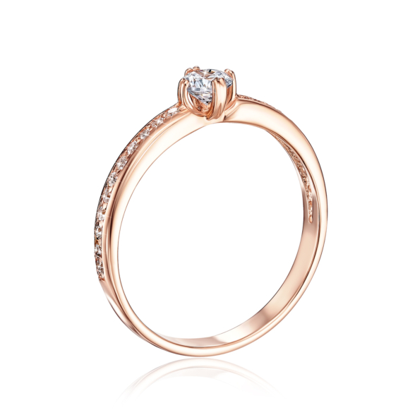 Каблучка з червоного золота з блискучими білими каменями зачаровує своїм вишуканим дизайном. Блиск розташованого в центрі круглого фіаніту гармонійно доповнює мерехтіння невеликих каменів на обідку прикраси. Вишукана прикраса неодмінно приверне увагу до своєї власниці, додасть її образу витонченість і чарівність.