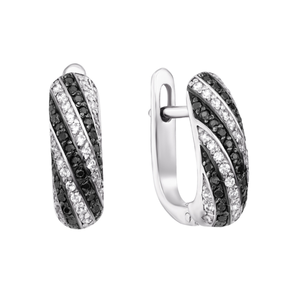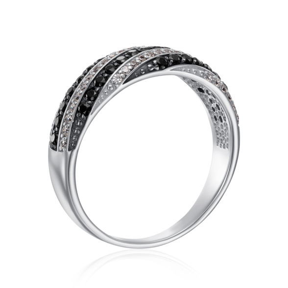 Золота каблучка з білого золота 585 проби, декорована фіанітами чорного і білого кольору