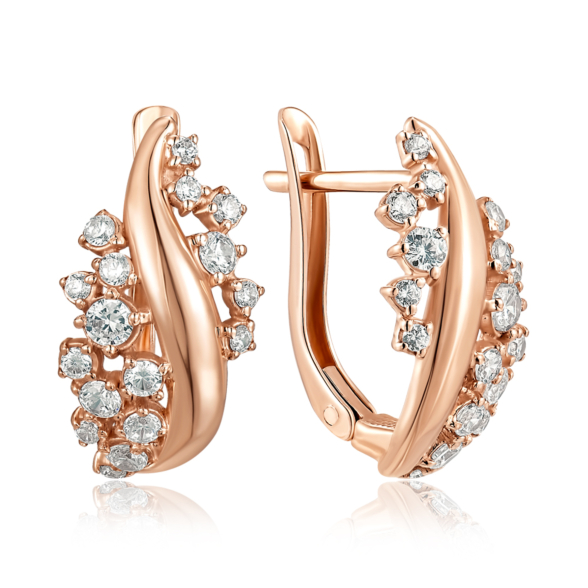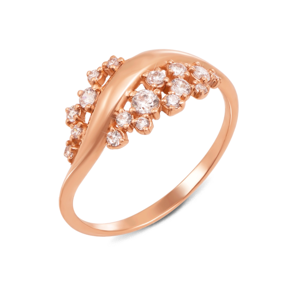 Каблучка з червоного золота 585 проби з прозорими фіанітами нагадує стебло квітки, на якій розташувалися мініатюрні квіточки. Фіаніти, розташовані по обидві сторони зігнутої золотої лінії, підкоряють своїм сяйвом, а м'який блиск полірованого золота робить композицію завершеною. Золота каблучка з фіанітами - це оригінальний подарунок для стильної жінки.