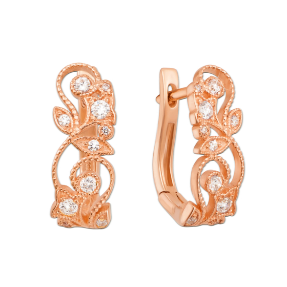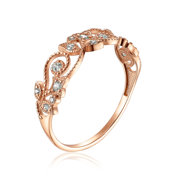 Каблучка з червоного золота 585 проби, без сумніву, приверне до вас увагу оточуючих і нікого не залишить байдужим. Найтонше ажурне плетиво, яке невагомою павутиною покриває верхню частину прикраси, виконано в кращих ювелірних традиціях. Граціозна симетрія цього ювелірного виробу надає йому особливу витонченість. Золота каблучка з фіанітами стане частим супутником на світських раутах і гідно доповнить найрозкішніші образи своєї власниці.