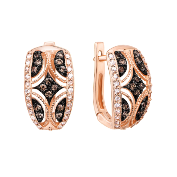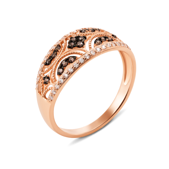 Каблучка з червоного золота 585 проби з прозорими і темними фіанітами - цей ексклюзивний ювелірний виріб, в якому поєднується краса і вишуканість, ніжність і розкіш. Золоті вигнуті півколом лінії, які оточують темні фіаніти, з'єднуючись одна з одною утворюють гармонійну композицію.