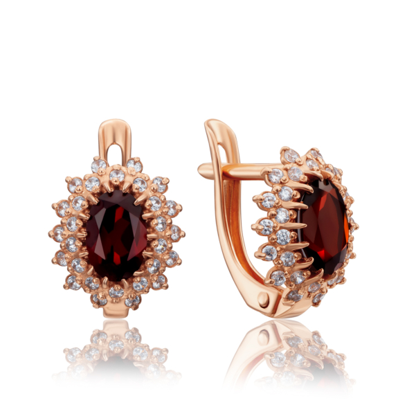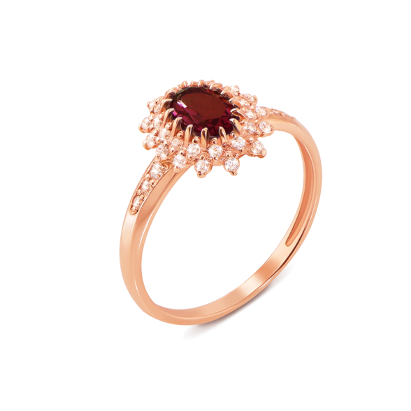 Каблучка з червоного золота 585 проби з гранатом і фіанітами