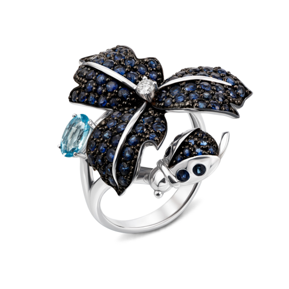 Каблучка з білого золота 585 проби з сапфірами, топазом swiss і діамантом
