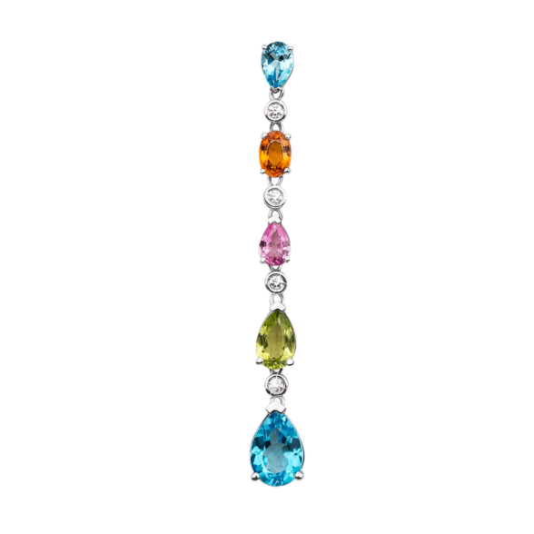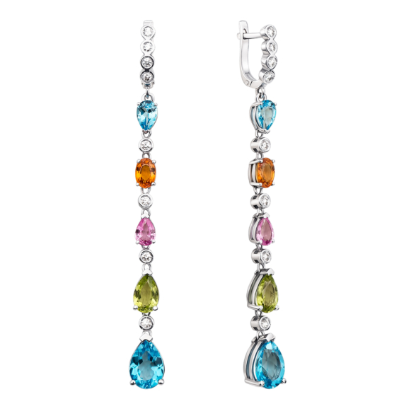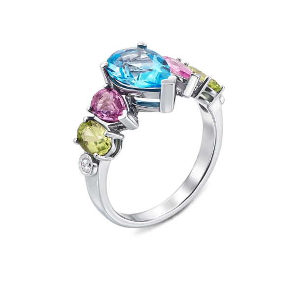 Каблучка з білого золота 585 проби з діамантами, сапфірами, хризолітами і топазом