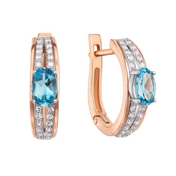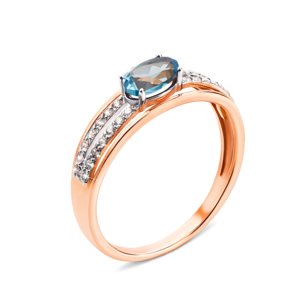 Класична тонка золота каблучка з напівдорогоцінним камінням по середині і з розсипом яскравих фіанітів, яка не підвладна моді і часу. Доріжка з маленьких круглих і яскравих фіанітів надають особливу гру і підкреслюють красу натурального каменю. Золота каблучка з блакитним топазом овальної форми підкреслить індивідуальність на руці власниці.