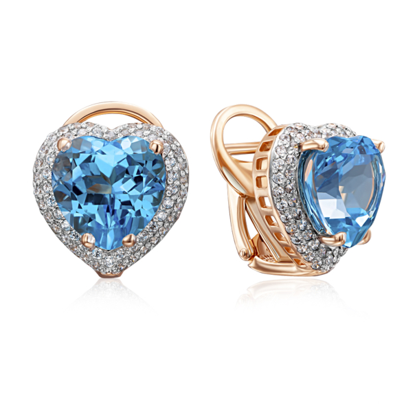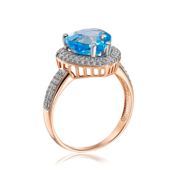 Каблучка з червоного золота 585 проби з блакитним топазом і фіанітами