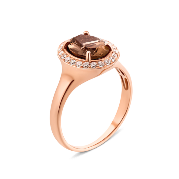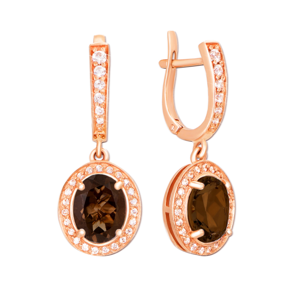 Сережки-підвіски з червоного золота з раухтопазом і фіанітами виконані в класичному дизайні, завдяки якому цей ювелірний виріб доповнить шикарний образ розкішної і блискучої жінки. Насичений колір напівдорогоцінного каміння підкреслюють прозорі фіаніти, які його обрамляють.